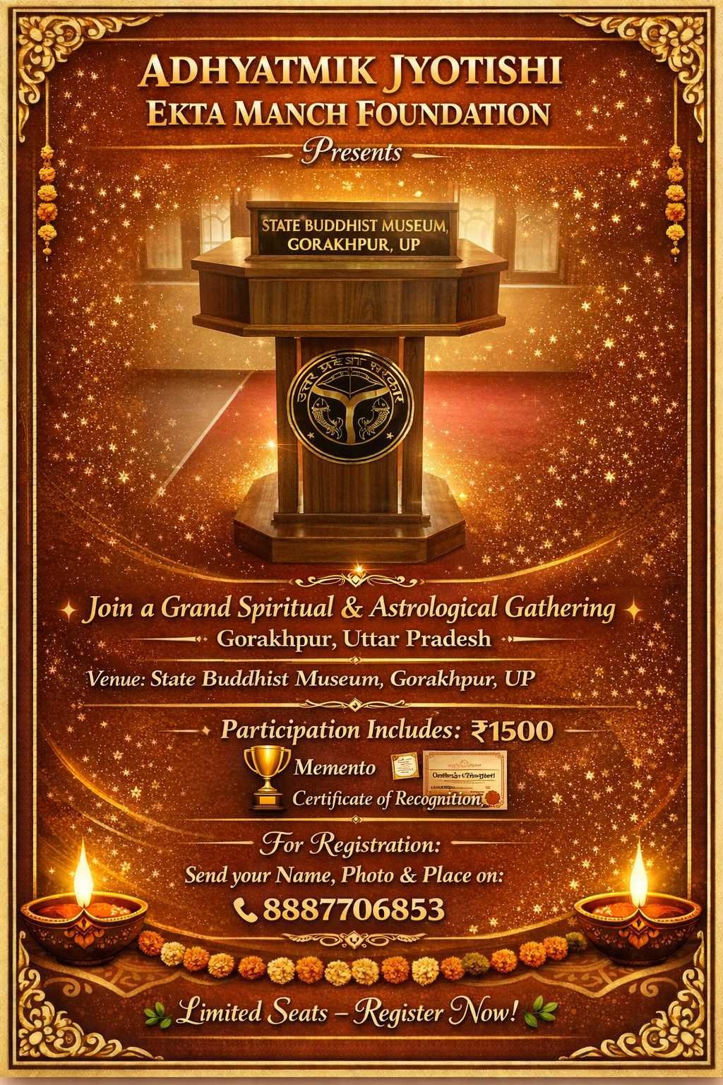*आध्यात्मिक ज्योतिषी एकता मंच फाउंडेशन का प्रथम राष्ट्रीय सम्मेलन*– 10 मई 2026 ज्योतिष जगत के लिए यह गौरवपूर्ण क्षण है कि आध्यात्मिक ज्योतिषी एकता मंच फाउंडेशन का पहला सम्मेलन 10 मई 2026 को समय अपराह्न 12 से 4 आयोजित किया जा रहा है। यह ऐतिहासिक कार्यक्रम राजकीय बौद्ध संग्रहालय परिसर में स्थित तारामंडल, गोरखपुर (संस्कृत विभाग, उत्तर प्रदेश) में सम्पन्न होगा, जो गोरखपुर की सांस्कृतिक पहचान का प्रमुख केंद्र है। यह स्थल सांसद निवास रवि किशन जी के निकट स्थित है, जिससे कार्यक्रम की गरिमा और भी बढ़ जाती है। इस सम्मेलन का उद्देश्य देशभर के ज्योतिषियों को एक मंच पर जोड़कर ज्योतिषीय एकता, सम्मान और संगठित शक्ति का निर्माण करना है। सहयोग शुल्क मात्र ₹1500 निर्धारित किया गया है, जिसमें प्रत्येक प्रतिभागी को स्मृति चिन्ह (मोनमेंटो) एवं प्रमाण पत्र प्रदान किया जाएगा। रुकने की व्यवस्था स्वयं करनी होगी अपने खर्च पर। आइए, इस ऐतिहासिक अवसर का हिस्सा बनें और ज्योतिष समाज की एकता एवं उत्थान में अपना योगदान दें।✨ रजिस्ट्रेशन के लिए संपर्क करें - 8887706853